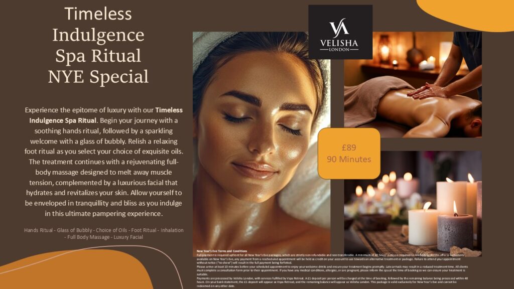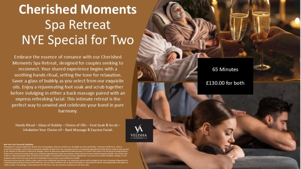 Payments are processed by Velisha London, with services fulfilled by Vspa Retreat. A £1 deposit per person will be charged at the time of booking, followed by the remaining balance being processed within 48 hours. On your bank statement, the £1 deposit will appear as Vspa Retreat, and the remaining balance will appear as Velisha London. This package is valid exclusively for Christmas Eve and cannot be redeemed on any other date.